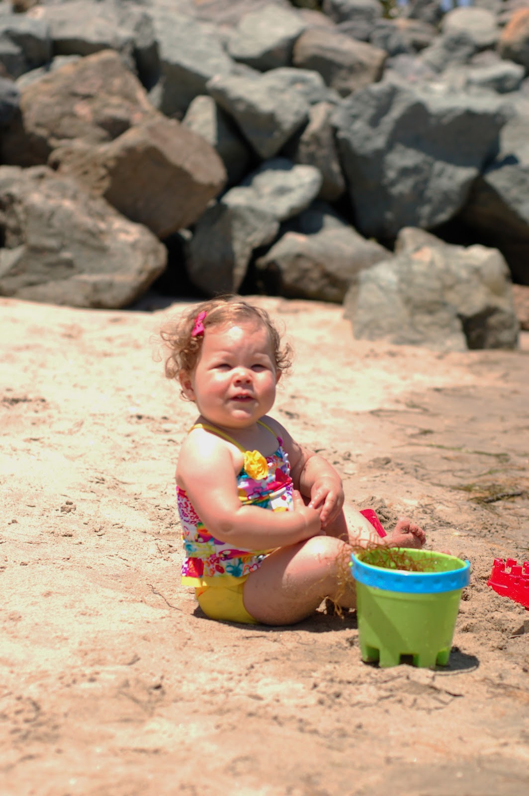 What do you do when its 93 degrees in Chula Vista? Go to the beach to cool off of course. Tia Mari was free today so she joined Callie and I for a lunch picnic and beach day in Coronado. We found a nice shady spot for our picnic and the cool ocean breeze was nice. After Callie ate everything I brought her for lunch she was ready for some action. I thought she would play in the sand as she likes the sand table at home, but instead she just wanted to play in the ocean. I guess she is the smart one since it is MUCH cooler in the water. I tried to get her to wear her hat to keep the sun off her face but she was not interested in wearing the hat. This was the first time I actually let her play in the ocean and she was loving it. There were probably 5 other kids at the beach but none of them were going in the water past their knees. Callie was fearless and wanted to be deep in the water and didn't even mind the small waves pushing her around. She did need me to hold her hands as the movement of the water really knocked her off balance. She played in the water for quite awhile and would have stayed longer but I didn't want her in the direct sun too long even with sunscreen so we went back to the shade. Thanks to Tia Mari I was able to capture some great photos and she took a few with me as well. Usually I don't have free hands to be able to take photos especially near the water as my fearless child will run right into the water. We had a very fun day playing at the beach and cooling off in the ocean. What a beautiful place we live in, we were right under the Coronado bridge in the bay and also you coould see downtown San Diego. What a nice backdrop for the real star of the photos! Big thanks again to Tia Mari for spending the day with us :)